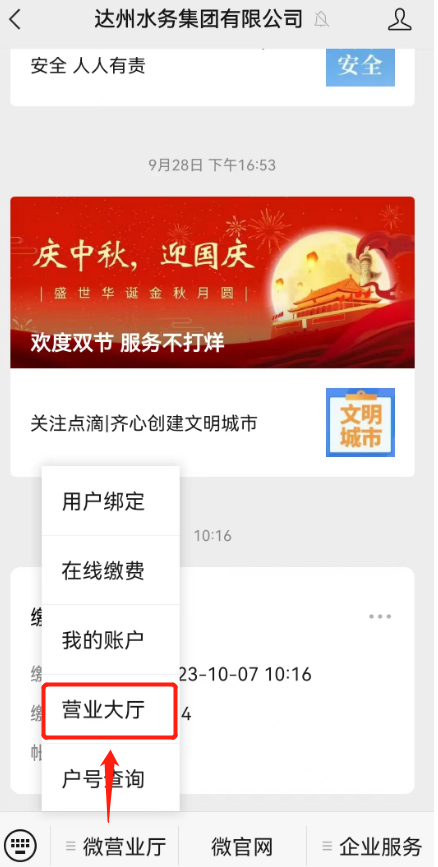 首先進(jìn)入達(dá)州水務(wù)集團(tuán)有限公司微信公眾號(hào),點(diǎn)擊微營(yíng)業(yè)廳-營(yíng)業(yè)大廳,進(jìn)入營(yíng)業(yè)大廳界面。