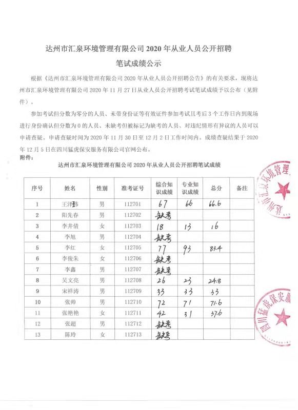 標(biāo)題:達(dá)州市匯泉環(huán)境管理有限公司2020年從業(yè)人員公開招聘參加筆試成績公示