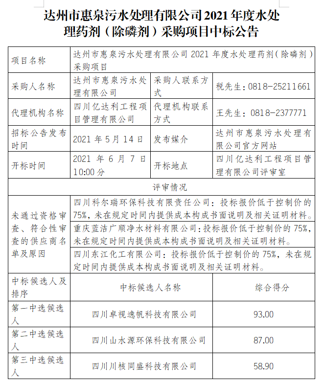 標(biāo)題:達(dá)州市惠泉污水處理有限公司2021年度水處理藥劑(除磷劑)采購(gòu)項(xiàng)目中標(biāo)公告